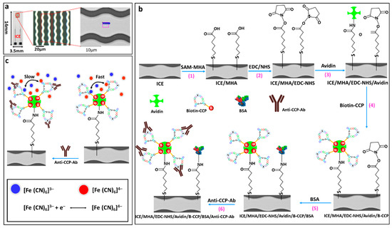In the present study, we developed an impedimetric immunosensor by taking the advantage of avidin–biotin interaction systems to attach the cyclic-citrullinated peptide (CCP) on the surface of SAM modified (6-mercaptohexanoic acid) interdigitated chain shaped microelectrode arrays (ICE). As a proof-of-concept, a synthetic peptide (biotin conjugated cyclic-citrullinated peptide; B-CCP) was selected as the bio-receptor to immobilize on the transducer surface for selective detection of the arthritis AAb (Anti-CCP-ab). The change in sensor response upon analyte binding on electrode surface is probed through the electrode interfacial property (charge transfer resistance; Rct) of EIS. The sensor was miniaturized (14 × 3.5 mm) and can be combined to fabricate a portable immunosensing device to detect Anti-CCP-ab for POC testing. The developed immunosensor (ICE/MHA/EDC-NHS/Avidin/Biotin-CCP/BSA) can selectively detected Anti-CCP-ab in HS within 10 min. Furthermore, the avidin-biotin bio-recognition system and SAM of MHA-modified ICE surface provided an excellent platform for the detection of rheumatoid biomarker by preserving the bio-activity of the immunogen (B-CCP). Based on the available studies and to best of our knowledge, this is the first report on miniaturized ICE configuration for rheumatoid marker detection in PBS and HS samples. The mechanism of the impedance sensing and schematic representation of the major electrode modification steps are presented in Figure 1.