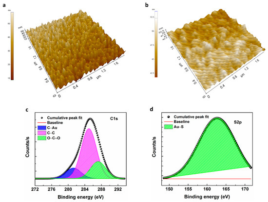 AFM topography images of the ICE electrode array before (a) and after (b) SAM functionalization. XPS spectra of the ICE electrode array modified with SAM-MHA: C1s (c) and S2p (d) region scans fitted using Gaussian cure fit with shrilly background subtraction.