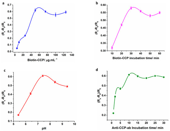 Optimization of the immunosensor for B-CCP concentration (a), B-CCP incubation time (b) and pH (c) and Anti-CCP-ab incubation time (d). The data points represent the average of three independent experimental values (n = 3), with the range indicated by standard error bars.