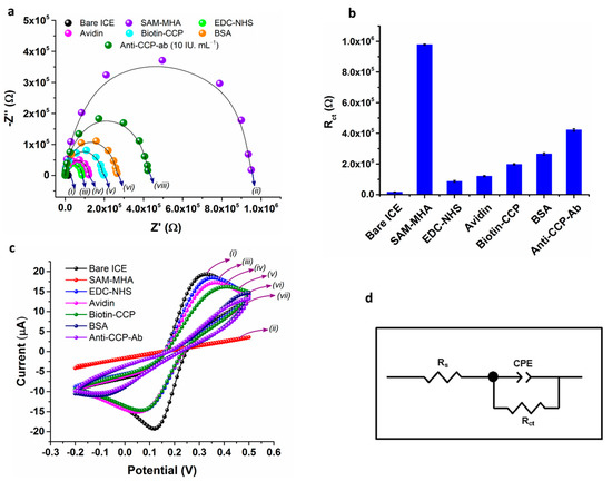 Impedance spectroscopy was employed to probe the electrode interfacial property on the ICE surface during the major stages of the electrode assembly. Figure 4a displays the measured impedance spectra represented as Nyquist plots (−Z″ vs. Z′) acquired on ICE electrodes during step-wise modification of the electrode in a background solution of 5 mM [Fe(CN)6]3−/4− (1:1) in 1 × PBS. The electrode interfacial property (charge-transfer resistance: Rct) was obtained by fitting the measured EIS spectra to an equivalent-circuit model (ZView; Scribner Associates Inc., Southern Pines, USA) as shown in Figure 4d. The EIS spectra of the bare ICE surface (Figure 4a, curve i) displays a small semicircle with Rct of 15640 Ω, which is characteristic for a bare gold electrode with no diffusional limiting process at lower frequencies, which is an additional benefit of the developed ICE microelectrodes. The diameter of the semicircle was substantially increased with a Rct of 978,900 Ω, due of the surface modification of ICE with mercaptohexanoic acid (Figure 4a, curve ii), suggesting that the alkanethiol film created an electrical hindrance for the electrons transfer between the [Fe(CN)6]3−/4− redox probe and the electrode surface. The semicircle diameter was significantly decreased with a Rct of 86,520 Ω (Figure 4a, curve iii), after the EDC-NHS carbodiimide coupling reaction with the terminal –COOH of MHA-SAM, suggesting that formation of succinimide ester on the SAM modified electrode surface facilitating the fast electron transfer between the electrode and the interface. The semicircle diameter is slightly increased (Rct: 120,400 Ω) with the linking of avidin on the SAM surface, due to the development of electron-blocking layer on the ICE surface by successful immobilization of avidin (Figure 4a, curve iv). The ICE/MHA/EDC-NHS/B-CCP impedance spectrum shows an increase in diameter of semicircle with a Rct of 197,400 Ω (Figure 4a, curve v) due to the formation of electron transfer obstruction layer on the electrode surface by the immobilization of B-CCP synthetic peptide, which is a highly non-conductive biological material. The rinsing of the electrode with 1 × PBS buffer containing 0.05% Tween-20 and 0.5% BSA for 2 min has again increased (Rct: 265,500 Ω) the diameter of the semicircle (Figure 4a, curve vi), due to the binding of BSA on ICE surface to prevent non-specific binding of the Anti-CCP-ab onto the ICE surface. Figure 4a curve vii shows a great increase in diameter of the semicircle (Rct: 421,700 Ω) when incubated with the Anti-CCP-ab for 10 min, suggesting the binding of analyte with the target and results in decrease in electron transfer rate by formation of ferrocyanide transport obstruction layer between the electrode surface and the electrolyte. The measured impedance spectra are consistent with the CV results (Figure 4c) demonstrating that the B-CCP has bound to the covalently attached avidin and the ICE/MHA/EDC-NHS/B-CCP/BSA immunosensor is successfully developed. Table 1 summary of the extrapolated fitting results of the measured EIS spectra for the circuit elements shown in Figure 4d.