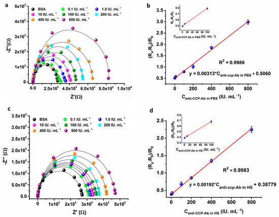 The binding of Anti-CCP-ab on the modified ICE surface and change in the electrode interfacial impedance was sensitively detected through impedimetric measurements of the electrodes in a frequency range of 0.1 Hz to 1 MHz. The change is impedance was detected by fitting the measured spectra to an equivalent circuit model (Figure 3d), where the changes in electrode interfacial impedance is calculated in terms of Charge-transfer resistance (Rct). The developed Anti-CCP-ab immunosensor was well characterized by measuring the changes in Rct, which represents the resistance of the electrode at lower frequencies. The results suggest that the change in Rct of the modified ICE electrode upon anti-CCP-ab addition is a critical factor for the quantitative determination of AAb in PBS and HS. Hence, the Rct was measured for a range of Anti-CCP-ab concentrations (0.1 IU mL−1 → 800 IU mL−1) on the modified electrode. The sensor response was represented as change in Rct denoted as ΔRct. The ΔRct was calculated by using the formula ΔRct = (Ra − R0)/R0; where Ra and R0 are the Rct of the modified electrode in the presence and absence of the analyte respectively. To assess the electrode response to Anti-CCP-ab addition, the developed ICE/MHA/EDC-NHS/B-CCP/BSA bioelectrode was incubated with different concentrations of Anti-CCP-ab prepared in 1 × PBS for 10 min. The impedance measurements were then carried out in 5 mM [Fe(CN)6−3/–4] (1:1) redox probe prepared in 1× PBS. As shown in Figure 5a, the Rct values linearly increased with increasing Anti-CCP-ab concentration. The ΔRct was also proportionate to the linear increase in Anti-CCP-Ab concentrations on the electrode over a range of 1 IU mL−1 → 800 IU mL−1 (Figure 5b). The regression equation for the sensor response in PBS was ΔRct = 0.5060 + 0.00313*Canti-ccp-ab(PBS) with a correlation coefficient of 0.9986 (Figure 5b).