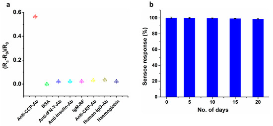 Reproducibility is an important factor for the potential application of the immunosensor in clinical diagnostics. Thus, the reproducibility of the fabricated ICE/MHA/EDC-NHS/B-CCP/BSA bioelectrode was verified by sensing Anti-CCP-ab (10 IU mL−1) on three independently prepared ICE/MHA/EDC-NHS/B-CCP/BSA bio-electrodes. The RSD calculated for the three measurements was 1.52%, suggesting that the fabricated immunosensor shows an acceptable reproducibility. The reproducibility for the three different ICE/MHA/EDC-NHS/B-CCP/BSA bioelectrode (R0) was also verified in 1 × PBS, and the results demonstrated a RSD of 1.02%. A very good reproducibility and stability is endorsed due to a robust Avidin-Biotin interaction system and covalent immobilization of avidin molecules on the gold surface, which created a bio-compatible substrate and prevents the removal of bio-receptors from the modified ICE surface. moreover, the presented impedimetric interdigitated microelectrode array sensor shows several advantages compared to the other reported methods for CCP detection. The developed assay (a) is label-free, (b) mass production of ICE at low cost, (c) no Warburg diffusion at lower frequencies, (d) requirement of low sample volumes (10 µL), (e) low-cost sample preparation, (f) a low assay time and (e) direct signal readout in the form of an electrical signal.