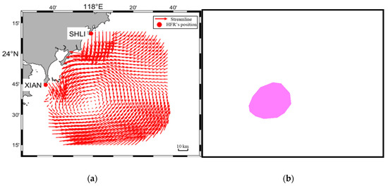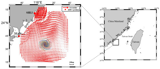 Different from the previous detection work, all of our data were collected from observations by HFRs. In the experiment, two OSMAR-S radars [32] were depolyed at Shanliao and Xiaan in Fujian province of China to jointly measure the sea surface current field. The distance between them is about 60 km. The observed region is to the southwest of the Taiwan Strait, and the observation lasts for 80 days, from 11 January 2013, to 31 March 2013. OSMAR-S is a compact HFR system designed by Wuhan University, which uses monopole as the transmitting antenna and monopole cross-loop antenna as the receiving antenna. The center frequency of the transmitting signal is 13 MHz. The sweep bandwidth is 60 kHz and corresponding range resolution is 2.5 km. During the experiment, the data rate at each grid point is greater than 0.85, and the quality of the measured data is high. Figure 1 depicts the observed region and one current velocity field during the experiment.