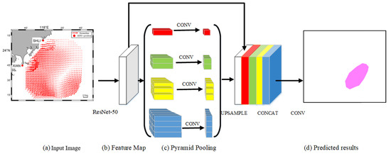 The traditional semantic segmentation method uses FCN. Due to the characteristics of no requirements on image shape and the relatively high efficiency, FCN is popular in the general semantic segmentation task. However, for the eddy detection task, the decision of eddy boundary needs a preceding division. Meanwhile, the relationship between the eddy pixels needs to be reconsidered for space consistency. PSPNet [34] supports a global pyramid of pooling layers to handle additional contextual information. It fuses different-level features to integrate the semantic information and detail information, which matches the offshore eddy detection task. Therefore, the DEDNet architecture is based on the PSPNet architecture, which ensures accurate division and maintains spatial consistency.