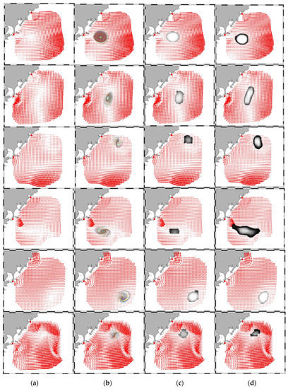 Oceanic eddy is a common phenomenon of seawater flow, which plays an important role in transporting energy and matter. Usually, an eddy is defined as a lateral current structure with velocity vectors rotating around a center in a clockwise or counterclockwise direction [1]. In oceanography, mesoscale eddies normally have sizes of 1–100 km and can survive up from 1 h to 1 year [2], and transports mass, heat, momentum, marine organisms, and biogeochemical along certain trajectories. Meanwhile, oceanic mesoscale eddies also have an interaction effective on clouds, winds, and rainfall, which indirectly influence the atmospheric dynamic environment [3,4]. Therefore, the detection and tracking of mesoscale eddies have important implications in the field of marine environment and atmospheric environment. Particularly, submesoscale eddies, which are between one to ten km in diameter and survive for periods of hours to days, play an important role as a link between the mesoscale eddies and the turbulent currents in the mass and energy transfer and thus are a key component of the global heat budget [5].