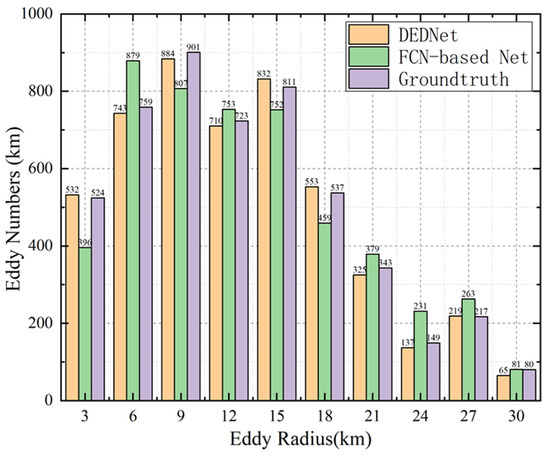 Figure 6 depicts the histogram of the eddy radius by DEDNet, the FCN-based network and the ground truth. It can be concluded that most radii of the offshore eddies are from 6 to 15 km. The number of eddies with a radius greater than 24 km is relatively small. This is mainly because the water in the offshore region is generally shallow, which makes it difficult to generate large-size eddies. The short duration of these small-size eddies may be due to the comprehensive topography and weather in the Taiwan strait. As can be seen from Figure 6, the number of eddies detected by DEDNet is similar to the ground truth results, but the FCN-based network shows an obvious difference. This also demonstrates that DEDNet performs better than the FCN-based network.