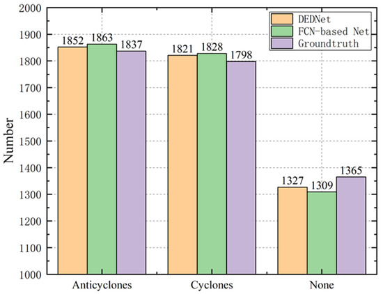 Figure 7 depicts the numbers of anticyclones, cyclones, and none eddies detected by the ground truth, FCN-based eddy network, and DEDNet. The numbers of the anticyclones and cyclones are similar, say about 1800, and that of the none eddies are about 1300. The statistical data imply that the offshore submesoscale eddies occur in the Taiwan strait with a relatively high frequency. The decision by the ground truth algorithm is stricter, which requires that the eddies’ twist degrees exceed a specific threshold and the eddy shapes are complete. Therefore, the difference between the network-based detection method and the ground truth algorithm mainly originates from two cases. The first is that several streamlines surround each other in the flow chart, but the twist degree does not reach the threshold. The network-based eddy detection needs more reasonable data to approach the threshold. Therefore, part of no eddies is mistaken as eddies. The second case is that some eddies are just located near the boundary of the observation region. Only part of these eddies can be seen in the flow chart, while other parts are out of sight. Due to the incomplete shapes, they are not able to be detected as eddies by the ground truth algorithm, and are counted into the category of no eddy. However, the network-based eddy detector can regard them as eddies due to the abstract eddy features. The network-based detection may miss a small number of eddies, but it can recognize a few more incomplete eddies. Therefore, the network interprets more eddies than the ground truth.