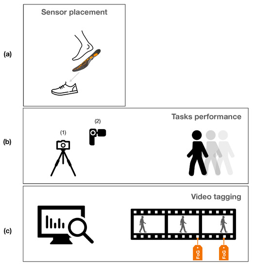 Data collection and processing protocol: (a) placement of the sensor insoles in the participants’ shoes, then worn; (b) video recording of task performance (open a door, getting up from the bed, walking, etc.); (c) video tagging of Freezing of Gait (FoG) episodes (onset, duration, end).