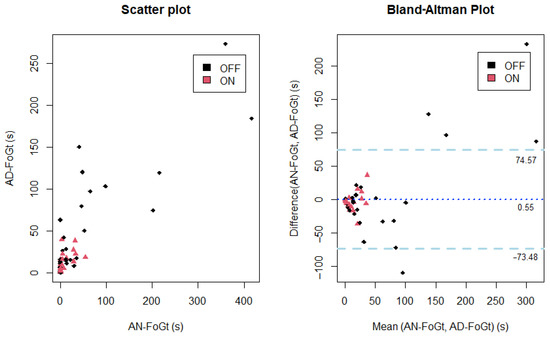 Scatter plot of the clinician’s annotated episodes (AN-FoGt) and algorithm detected FoG episodes’ duration (AD-FoGt) on the left side and Bland–Altman plot on the right.