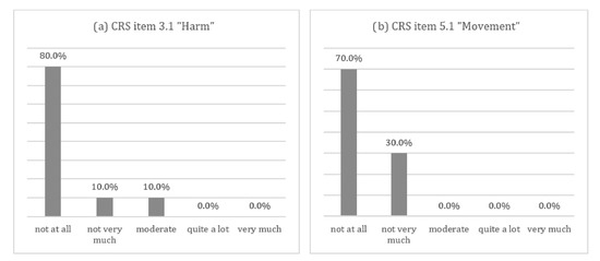 Chart of the Comfort Rating Scale’s (CRS) most representative items: (a) patients’ answer to the Comfort Rating Scale Item 3.1 “Harm”: the device caused me some harm (e.g., headache, pain, itching, irritation, etc.); (b) patients’ answer to the Comfort Rating Scale Item 5.1 “Movement”: the devices badly affects the way I move or slows down or obstructs my movements.