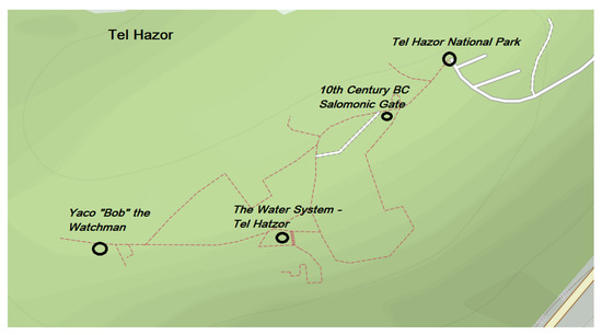 Lead by Yigal Yadin, major archaeological excavations took place at Tel Hazor in the 1950s, which revealed bronze and iron age structures and evidence of both Canaanite and, then later, Israelite settlement [30,31,32,33]. The site has been of interest to biblical scholars, archaeologists, and historians [31] and has been studied together with several other similar ancient ruins in the region [33,34]. The largest individual remaining structure in Tel Hazor is an underground water system, which was discovered by Yadin’s later 1968–1969 expeditions and has been dated to the Iron-age [35]. Similar water systems have been found in several cities on top of mountains from the same time period [35]. Another major structure is a “Salomonic city gate”, dating of which has been discussed by scholars to be either from the time of Salomon (10th century BCE) or the Omrid dynasty (9th Century BCE) [34]. In addition, other structures, mostly interpreted as housing, remain on site [36], including a typical 8th century BC Israelite four-room house [37,38].