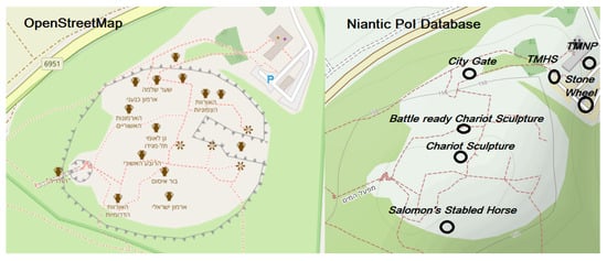 Figure 2 shows a side-by-side comparison of PoIs in OSM (screenshot taken by the authors) and Niantic virtual PoIs (7) displayed on top of the same OSM background. From the comparison, we see that the PoIs in OSM are much more detailed but still do not depict he entire archaeological richness of the location. The Niantic PoIs are much more generic and contain only a single historical location: the city gate. Three of the Niantic PoIs are signs: Tel Megiddo, Tel Megiddo World Heritage Site, and Tel Megiddo National Park. Then, there are three scultupres: Battle Ready Chariot Sculpture, Chariot Sculpture, and Salomon’s Stabled Horse. Unlike in Hazor, the PoIs in Megiddo do not offer direct references to ancient structures, except for the city gate. For example, the water system is not a PoI, and neither is the ruin of the Bronze Age (3000 BCE) Canaanite temple [41]. Furthermore, the naming of the PoIs and their descriptions do not depict that there is an ongoing scholarly debate on the dating of the strata VB and VA-IVB (see Table 2).