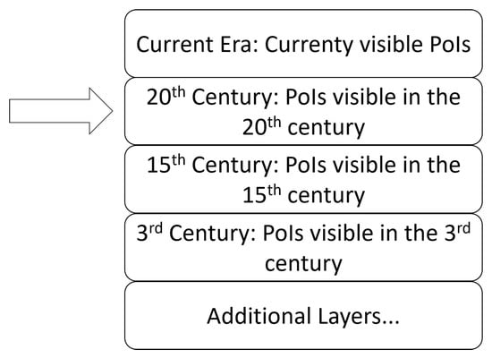 The first thing to address, that is particularly relevant at archaeological sites, is the problem of visualizing structures that no longer exist. For example, several historical buildings have been destroyed and at archaeological sites excavations to deeper strata require the destruction of what is on top. However, having currently visible and destroyed structures displayed on a map interface for LBA users can be confusing. Furthermore, this would make it more difficult for users to visualize what their environment looked like at a given era. For this reason, we propose that a PoI database for teaching local history should be divided into layers. The topmost layer would represent structures that are currently visible in the world. In addition to this layer, historical layers would be included. LBA users could choose whether they want to see PoIs of the current era, or a from previous era. This is displayed in Figure 3.