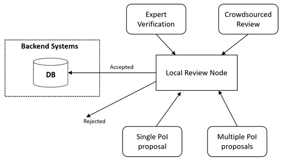 Based on the expert evaluation, we made final adjustments to the proposed solution. There are three use cases [26] of our PoI database scheme that we discuss in this section. First is the basic suggestion and review loop in PoI creation and maintenance. This is displayed in Figure 4. LBA users can submit either individual PoIs or multiple PoIs for review. The reviews can be provided either by experts or crowdsourced to other LBA users. In case the reviews are favorable, the PoI suggestion will be moved to the global backend systems for further processing. The local review node operates as an edge computing resource that is able to significantly reduce the computational load and traffic to the main backend systems. In addition, data transmission is faster between users and the local node in comparison to if users communicated directly with the global backend systems.