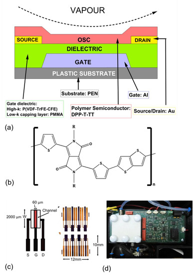 - Tate, D.J.; Danesh, E.; Tischler, V.; Faraji, S.; Majewski, L.A.; Turner, M.L.; Persaud, K.C. Fully Solution Processed Low Voltage OFET Platform for Vapour Sensing Applications. In Proceedings of the ISOEN 2017—ISOCS/IEEE International Symposium on Olfaction and Electronic Nose, Montreal, QC, Canada, 28–31 May 2017. [Google Scholar] [CrossRef]