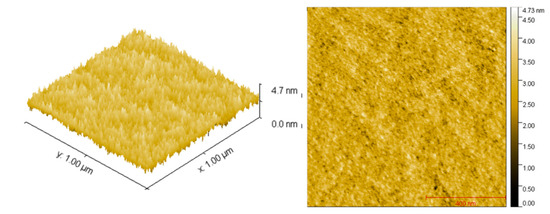 Tapping mode AFM (Figure 2) revealed homogeneous nano-grain morphology with a low RMS roughness surface roughness Rq of 0.42 nm.