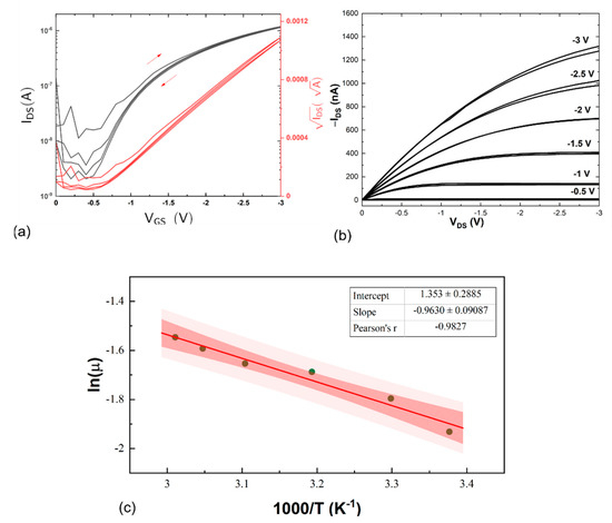 (a) Transfer curve used to establish the operating characteristics of the OFET devices—the devices were scanned 4 times between 0 and −3 V VGS to observe the hysteresis of the devices; (b) the output curve at different VGS voltages between 0 to −3 V; and (c) the Arrhenius plot of the dependence of mobility with temperature established an Ea of 82 mV.