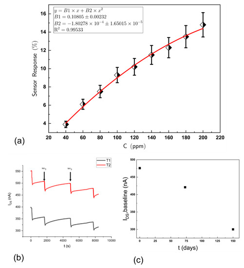 (a) Concentration–response curve for ammonia between 40 and 200 ppm. This is best fitted by a second order polynomial equation; (b) raw data responses from two OFET devices to repeated exposure to ammonia; (c) baseline IDS for one device monitored over 5 months showing a decrease in current but a still usable device after this period.