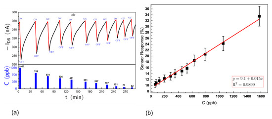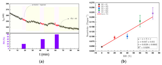 (a) Plot of IDS for an OFET device when exposed to different humidity levels. The baseline was in dry air, the lower panel illustrates when different changes in humidity were applied and the red portion of the IDS trace above highlights the current during this exposure; (b) the apparent increase in OFET sensitivity to ammonia with increasing relative humidity (RH). A series of concentrations of ammonia ranging from 20 to 100 ppm were presented to the OFET sensor while varying the RH from 0 to 80%. The IDS was measured at VGS of −3 V and VDS of −3 V. From the resulting concentration–response curves at each humidity step, the gradients of the curves were extracted and plotted here as sensitivity versus %RH.