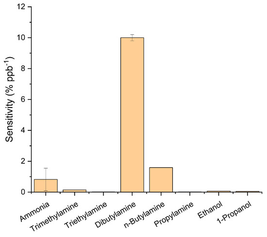 To attempt to correlate the relative sensitivity of the OSC for different analytes, the response curves to varying concentrations were measured for ammonia, a series of alkyl amines and two alcohols, producing similar data to those illustrated in Figure 4 and Figure 6. The measured sensitivities derived from the gradient of the concentration–response curves for three replicate OFETs are summarised in Table 1 (column 6) and Figure 7. They illustrate the high selectivity of DPP-T-TT OSCs to dibutylamine against the other compounds investigated, which could not previously have been predicted.