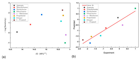 (a) Quantitative structure–activity model (QSAR) plot of log (sensitivity) versus the dispersion force (δD) for each analyte tested. No coherent trend can be seen; (b) good correlation is seen between the experimentally derived sensitivities for a series of amines with the predicted values from the model based on the Antoine constant C and the heat of vaporization at boiling point (Equation (9)).