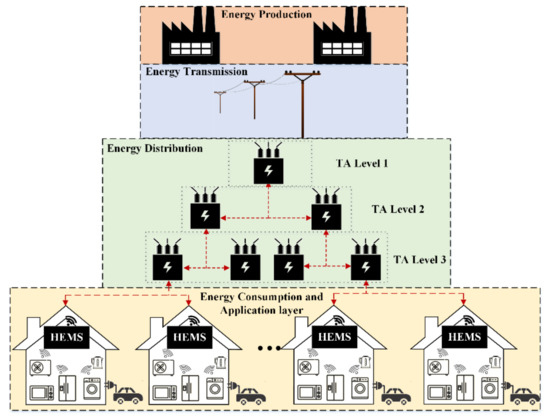 With the advances in smart appliances, home appliances are now a part of the IoT ecosystem while the smart grid positions itself as an ideal example of an Industrial IoT (IIoT) system [32]. Figure 1, illustrates the major elements of this ecosystem. At the top level, we have generators that could be based on conventional or renewable energy sources. Then, the produced energy is transported through transmission lines to the distribution system transformers, which is called as transformer level. At energy distribution level, each Transformer Agent (TA) will balance the voltage and frequency to be suitable for residential usage by stepping up/down the voltage. At the residential level, HEMS, as an IoT device, communicates with TA to send the customer’s usage data to the utility. The household IoT devices (such as HVAC, EV, washing machine and etc.) communicate with HEMS through Wi-Fi or Zigbee and create a small network inside the house.