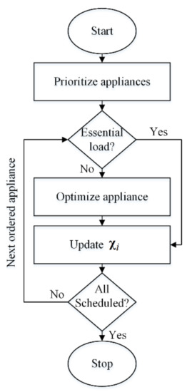 We implement load optimization, described in the following subsection, within a sequential approach. This is illustrated in the flowchart provided in Figure 2. This sequential scheduling considers the appliance load profiles entered into the load vector by order of priority. Note that the summation of across the time horizon should be almost equal to the summation of all the appliances’ load profiles: