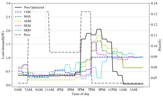 Figure 4 presents the optimized power consumption of scenario A in six different models: our CSM, versus MAS, ADM, HEM, MHO and the non-optimized case. Note that for MHO implementation, we choose the order of inconvenient, cost and peak optimization (scenario 3 in [28]) which is closer to our proposed architecture. This figure shows the average result of 10 runs. The price signal presents different tiers of ToU pricing (off-peak, mid-peak and on-peak). As observed from the figure, the proposed model reduces the peak consumption almost 30% more than the MAS, ADM and HEM, and 15% more than MHO in scenario A.