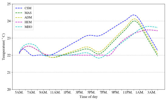 Figure 5 gives the cost profiles for the load demands of Figure 4. Due to the flattening impact of our CSM scheme, its overall cost is lower than the other schemes. Figure 6 illustrates how the temperature is fluctuating over different time slots in the compared approaches. The five models are consuming the same amount of power in a day to keep the room warm but their temperature is different on different time slots. Our approach is keeping the temperature in ASHRAE standard range and increasing the temperature close to which is the best room temperature in winter. The approaches MAS, ADM and MHO schedule the total energy regardless of thermal comfort formulation but consuming the same minimum range of electricity for thermal load during a day.