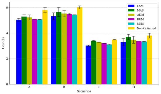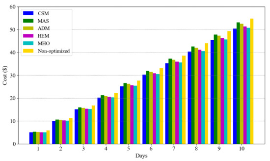To ensure that our approach is robust with regard to parameter choice, we repeat scenario A for 10 days and calculate the cumulative cost for different approaches; the results are presented in Figure 7. Our approach is seen to always have less cost than the others. The reason that MAS has higher cost than ADM is that, in the former, the deferrable loads are non-interruptible which constrains usage time but in the latter they are interruptible and unconstrained. Also, HEM and MHO have almost more accumulated cost than CSM which is due to the lack of essential load consideration on their scheduling. Moreover, we can assert that within 10 days of consumption, customer saves almost $5 and if we extend it to a month the saving would be $15. Note that the average cost of electricity bill in Ontario, Canada is $125 per month [41]. Therefore, the customer’s savings would be considerable.