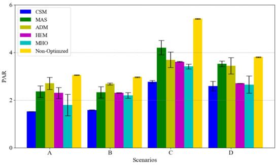 Regarding to Figure 9, the PAR in our model is the minimum one and the reason why ADM has less PAR than MAS in scenarios C and D is due to the interruptible deferrable load assumption in ADM model (in scenario C and D number of deferrable loads are increased). Moreover, HEM and MHO has less PAR than ADM and MAS, because of their optimization models, GA and MILP. Also, it shows that the appliance usage priority and clustering have positive effects on finding proper time slots for the appliances consumption especially for the elastic load with high demand. Finally, we can assert that we reduced the cost almost 8%, 6%, 5% and 3%, and reduced PAR almost 34%, 33%, 24% and 17% more than MAS, ADM, HEM and MHO respectively.