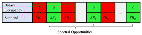 This work aims at predicting spectrum occupancy states over a given frequency range depending on the previous occupancies. For modeling the spectrum access, the heterogeneous spectrum access model [] is adopted. This model is demonstrated in Figure 2. More specifically, the spectrum is split into k contiguous frequency subbands. In this model, the absence (presence) of a PU means signifies a hole (occupied spectrum). The following hypotheses ( and ) formally states these cases.