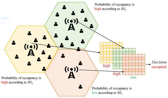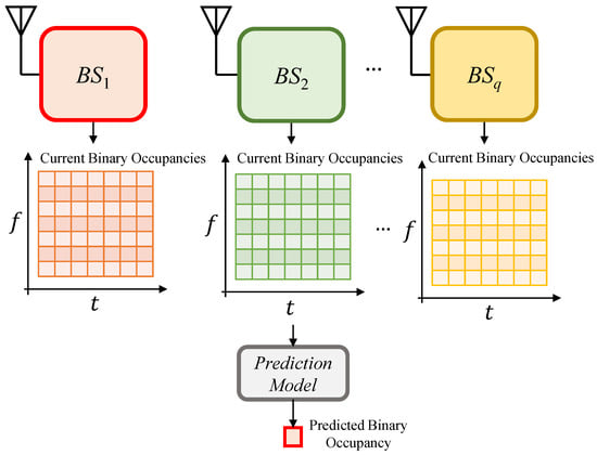 In addition to the time and frequency correlations, the exploitation of spatial correlation is advantageous for the spectrum occupancy prediction problem, as illustrated in Figure 4. Here, (main BS) is the BS that the spectrum occupancy prediction will be made on. It can be seen from this figure that when is trained without any prior information from and (neighboring BSs), it decides on the future spectrum as non-occupied. However, and are full, and the user of and can occupy the spectrum of the for the upcoming intervals, so the number of occupied bands will increase for . Exploiting the information from this dimension, spectrum occupancy can be predicted more reliably.