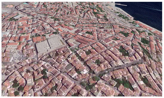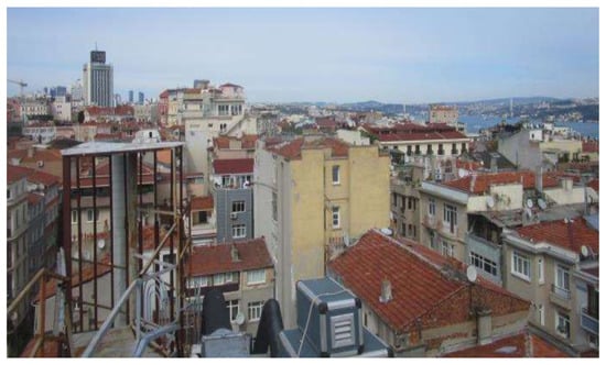For the measurements with high user activity, data were collected simultaneously for the whole spectrum at Taksim Square, Istanbul. The measurements were started at midnight local Istanbul time (GMT+3) on 7 August 2020, and ended at midnight on 14 August 2020. It is worth mentioning that Taksim has one of the most crowded streets in the city, with contiguous buildings around. Taksim is a flat street within a high altitude overlooking high-rise areas in general. Also, it has a central metro station, and it is an important point for transportation. That makes the area very crowded around commute times and rush hours. Furthermore, there are many dining places that make it crowded also at lunch and dinner times. Figure 7 shows a picture of the environment for the Taksim area, which has been taken from the corresponding BS. In addition, satellite captures of the area are shown in Figure 8 to show the area with a wider perspective.