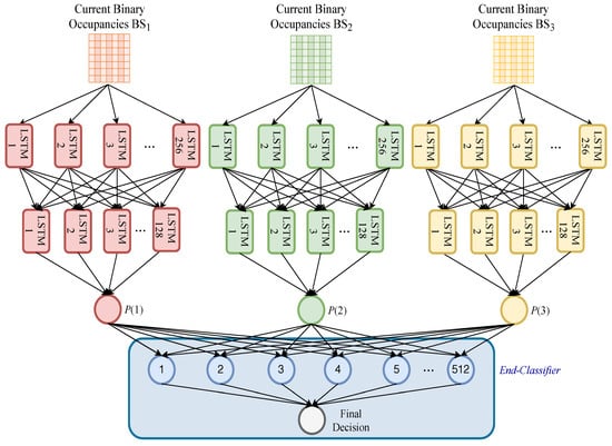 Once the training data are obtained, the DL model is configured to have a total number of q models, where q denotes the number of spatially-correlated BSs, and each model accepting as input a time-frequency occupancy grid. As mentioned earlier, this configuration simultaneously incorporates space correlation and time-frequency correlations. More specifically, each LSTM model is trained over a set of pairs of a given time-frequency occupancy grid and the corresponding ground-truth occupancy status of the main BS. Then, each DL model calculates a probability of occupancy (P). The occupancy probabilities of all q models are augmented to form an occupancy probability feature vector. Afterward, the occupancy probability vector, along with the true occupancy state, form the training data pair of the end-classifier to incorporate space correlation. Finally, the end-classifier is trained over this data pair. These processes are presented in Figure 5.