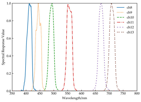 To obtain the average equivalent radiance of each channel, however, the obtained hyperspectral signal value still need to be convolved with the spectral response function of the sensor shown in Figure 1. The bands-averaged TOA radiance is given by,