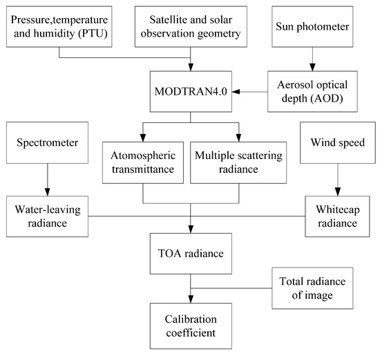 Figure 2 illustrates the process of vicarious radiometric calibration. The pressure, temperature and humidity, zenith and azimuth angles of the satellite and sun, aerosol optical depth (AOD) and water-leaving radiance data were collected and input into MODTRAN4.0, and the atmospheric transmittance and multiple-scattering radiance were output.
