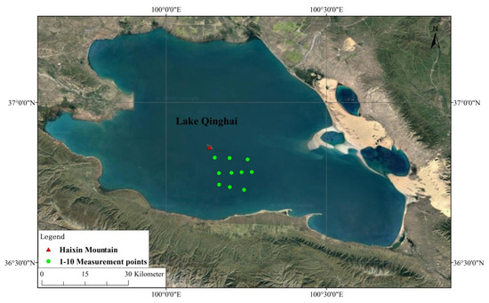 As shown in Figure 4, an approximately 10 km × 10 km area southeast of Haixin Mountain in the middle of the lake was selected for the synchronous in situ observation experiment. By means of fixed-point stop-ship measurements, ten measurement points were selected to carry out field measurements in turn within an hour before, and after, the satellite overpass.