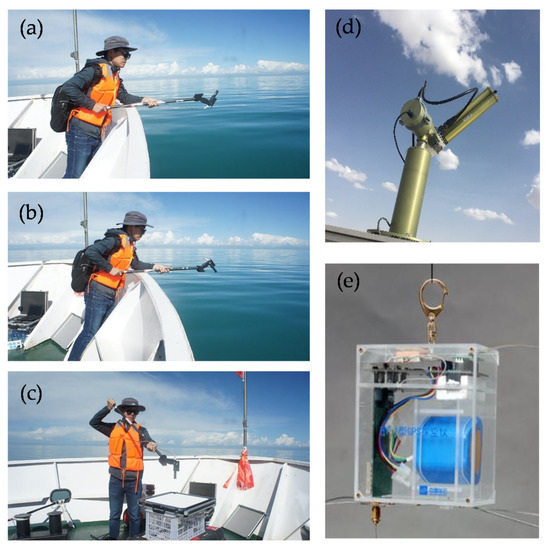 Observation equipment used in the experiment: (a–c) an ASD FieldSpec4 spectrometer for acquiring water surface parameters; (d) a CE-318 automated sun photometer for measuring atmospheric parameters; (e) a GPS radiosonde for obtaining PTU.