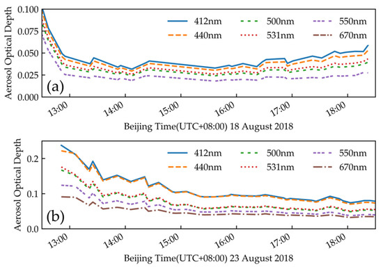 AOD (a) at 14:38 (UTC + 08:00), 18 August 2018; (b) at 14:43 (UTC + 08:00), 23 August 2018.