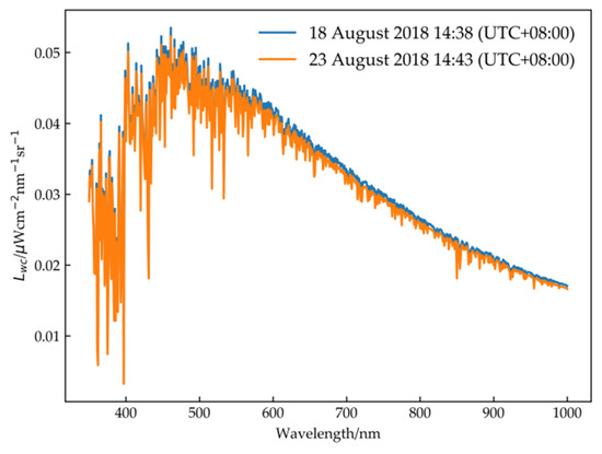 Figure 6 shows the variation trend of water-leaving radiance and remote sensing reflectance. The maximum value of the two-day water-leaving radiance is taken near 545 nm, while the signal on the water after 700 nm is very weak.