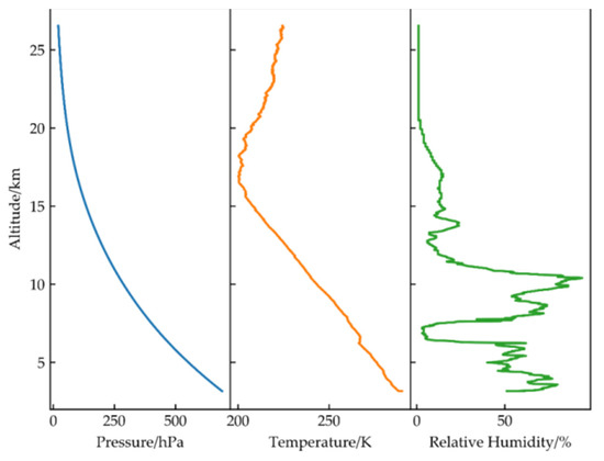 It can be seen from the formula that the higher the wind speed is, the greater the whitecap radiance. Thus, the experiment was carried out when the wind speed was less than 5 m/s. Figure 8 shows the whitecap radiance at various wavelengths at a wind speed of 4 m/s. The figure shows that the maximum value is only 0.05 at approximately 500 nm. Under calm sea conditions, the contribution of whitecap radiance has little influence on the vicarious calibration. Figure 9 shows the curve of each parameter changing with altitude. As seen from the PTU profiles, with increasing altitude, the pressure decreases, the temperature first decreases and then increases, while the relative humidity exhibits no obvious change pattern. We divided the PTU profiles into 32 layers to more accurately describe atmospheric characteristics at different altitudes.