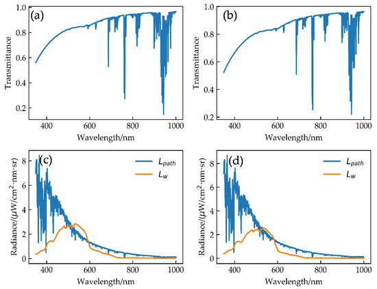 (a) Atmospheric transmittance at 14:38 (UTC + 08:00), 18 August 2018; (b) atmospheric transmittance at 14:43 (UTC + 08:00), 23 August 2018; (c) multiple scattering radiance and normalized water-leaving radiance at 14:38 (UTC + 08:00), 18 August 2018; (d) multiple scattering radiance and normalized water-leaving radiance at 14:43 (UTC + 08:00), 23 August 2018.
