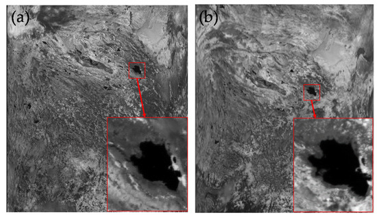 Satellite images: (a) 14:38 (UTC + 08:00), 18 August 2018; (b) 14:43 (UTC + 08:00), 23 August 2018.