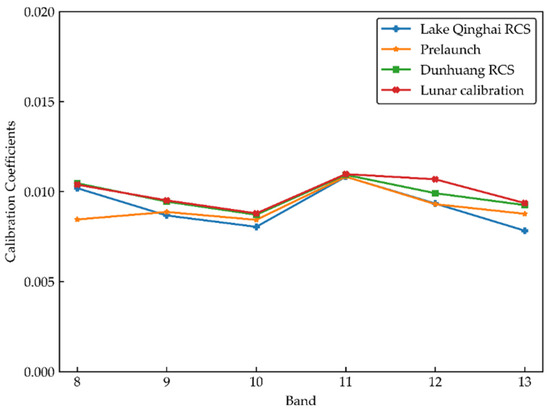 The results for the calibration coefficients show an average difference of −17.056%, 2.278%, 4.799%, 0.061%, −0.353% and 11.963% when compared to the prelaunch calibration coefficients. In general, since the launch of the remote sensor, the calibration coefficients of most bands, except bands 8 and 13, are relatively stable, and the relative deviations are within 5%.