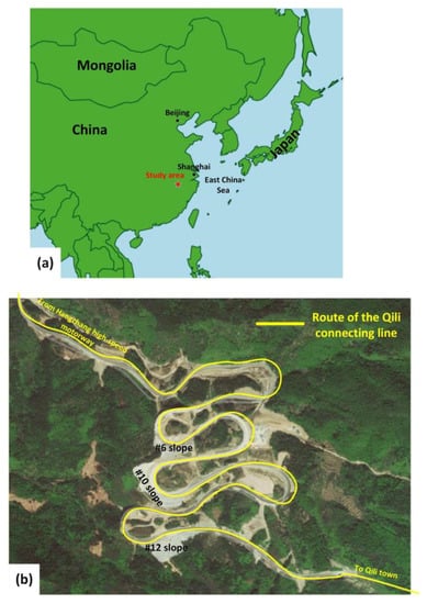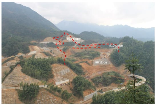 The study area was located in the Yangtze River Basin on the southeastern coast of China, 430 km southwest of Shanghai International Airport (Figure 1a). The construction project connects the Hangchang high-speed motorway to Qili town in Quzhou City in Zhejiang Province, China (yellow curve in Figure 1b). The total length of the route is 7.725 km. During the construction process, three high-steep slopes (#6, #10 and #12 in Figure 1b) were formed. The terrain where the route is located is dominated by high-steep mountains, with the highest point at 1050 m.a.s.l. and the base at 437 m.a.s.l. Excluding limited Quaternary deposit, the study area is composed of Upper Jurassic breccia, tuff, conglomerate, sandstone and mudstone. The Lower Ordovician calcareous mudstones, carbonaceous mudstones and marls are beneath the Upper Jurassic rocks. The lithology of the project area from top to bottom includes gravel with clay, strong weathered glutenite and mudstone, moderately weathered sandstone and glutenite, strong weathered mudstone, moderately weathered mudstone, carbonaceous mudstone, sandstone and glutenite. The region is located between the Shangfang–Yeling syncline and the Qianligang syncline. It is a northwest-inclined monoclinic formation. The site is mainly affected by the Jiehu–Xiushu fault. Faults, joints and cracks are strongly developed along the project site and thus the integrity of the rock masses is very poor.