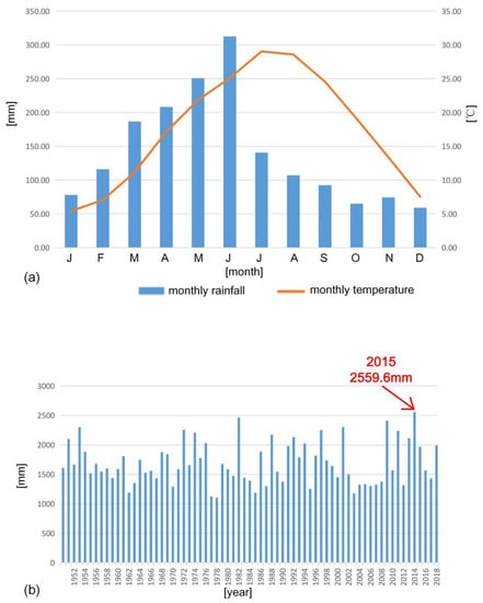 Rainfall and temperature distribution in Quzhou City: (a) Climatograph constructed by averaging monthly rainfall data recorded since 1951 and temperature data available since 1951; (b) Historic record of annual rainfall in Quzhou City from 1951 to 2019.