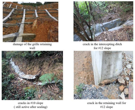 In-situ photos of some cracks are shown in Figure 4. Although engineering treatments, such as surface drainage, underground drainage, load reduction and back pressure, were performed, the cracks were expanding and interconnecting until December 2015 (shown in Figure 5). An on-site inspection and preliminary survey results in December 2015 revealed that cracks surrounding the #6, #10 and #12 slopes were linked. Rock masses encountered many dislocations and the mountain showed a trend of potential overall slope failure.