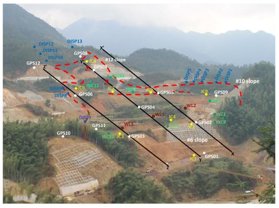 The deployment of monitoring devices is shown in Figure 6. It was designed based on the results of the field survey and the existing geological survey. Due to the large volume and wide range of potential sliding bodies on the project site, both the overall and local deformation characteristics were considered. Three monitoring profiles were investigated, covering the entire landslide body (X-X′, Y-Y′, Z-Z′ in Figure 6). The monitored parameters included displacement in the surface, displacement in the depths, width of gravity-induced joints, meteorological data and groundwater level.