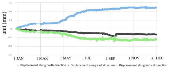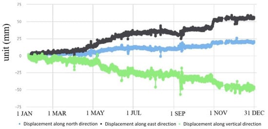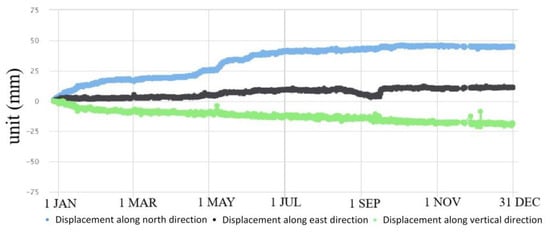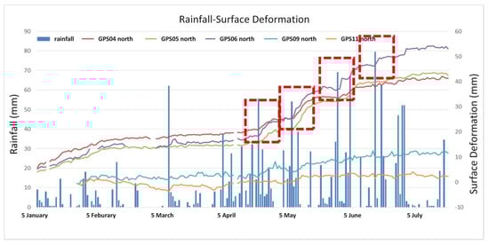 GPS 04, 05, 06 and 09 had significant displacement trends, accompanied by surface subsidence (Figure 7, Figure 8, Figure 9 and Figure 10). GPS 04 recorded 14 mm displacements to the north in the first month of monitoring. From 31 January to 20 April, the deformation rate reduced and the total displacement to the north was 7 mm during this time. From 21 April to 7 June the deformation rate increased due to heavy rainfall of 637 mm. Then the deformation rate turned stable. GPS 05 recorded 13 mm displacements to the north in the first month of monitoring. From 4 February to 20 April the deformation rate was stable. From 21 April to 7 June the deformation rate increased due to heavy rainfall and the total displacement to the north was 24 mm during this time. GPS 05 was removed due to construction work in August. GPS 06 moved 13.6 mm to the north in the first month of monitoring. From 31 January to 20 April, the deformation rate was stable. The displacement to the north reached 41 mm during the rainy season from 21 April to the end of June. The slope where GPS 09 was installed showed significant deformation and subsidence. The device moved toward north by 20 mm, east by 60 mm and in a vertical direction by 50 mm.